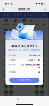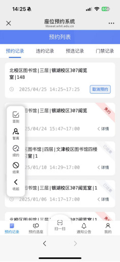 到达现场后扫描座位上的预约二维码进入预约界面,操作同网络预约。