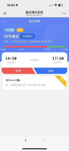座位使用完毕后点击“结束”按钮即可完成座位的释放。可以在主界面中点击“结束”按钮,也可以在座位页面点击“结束”按钮。
