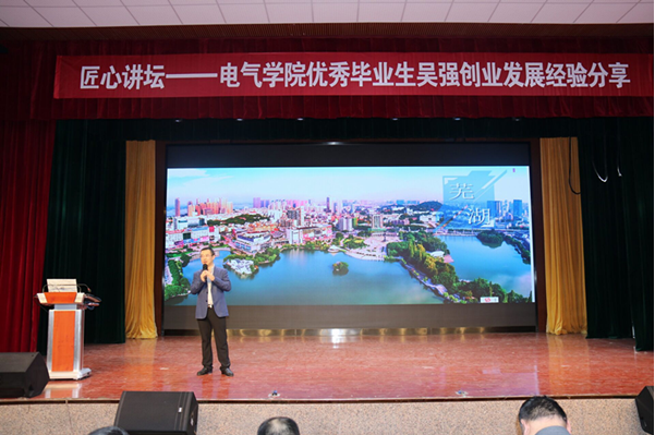 吴强从自身经历出发,讲述了自己成功创业的故事。其毕业后积极投身创新创业浪潮,凭着敏锐的市场洞察力,吃苦耐劳和坚持不懈的奋斗精神,在国家有序推进新能源产业化和市场化进程中,抓住机遇乘势而上,于在2018年1月31日圆了自己的创业梦,成立了自己的公司——芜湖黑特新能源汽车科技有限公司。公司经营新能源汽车零部件开发、生产和销售等范围业务。