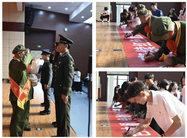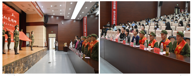 在张治中的带领下,四位退伍老兵来到活动现场,我院青年志愿者们真诚地为他们带上了胸花和绶带,同学们以最热烈的掌声欢迎老兵们入场。伴随着国旗护卫队整齐的步伐,嘹亮的国歌响起,隆重而肃穆的气氛下,本次活动拉开了序幕。学生处副处长王璐璐上台致辞,表达了对老兵们最崇高的敬意,她再三嘱托在场的同学们,一定要心存感恩、珍惜当下、铭记过去。红色血脉代代相传,我校退伍兵学生代表向退伍老兵敬礼并向他们献上鲜花,老兵以军礼回敬,此时此刻意义非凡,红色精神代代传承,永垂不朽。
