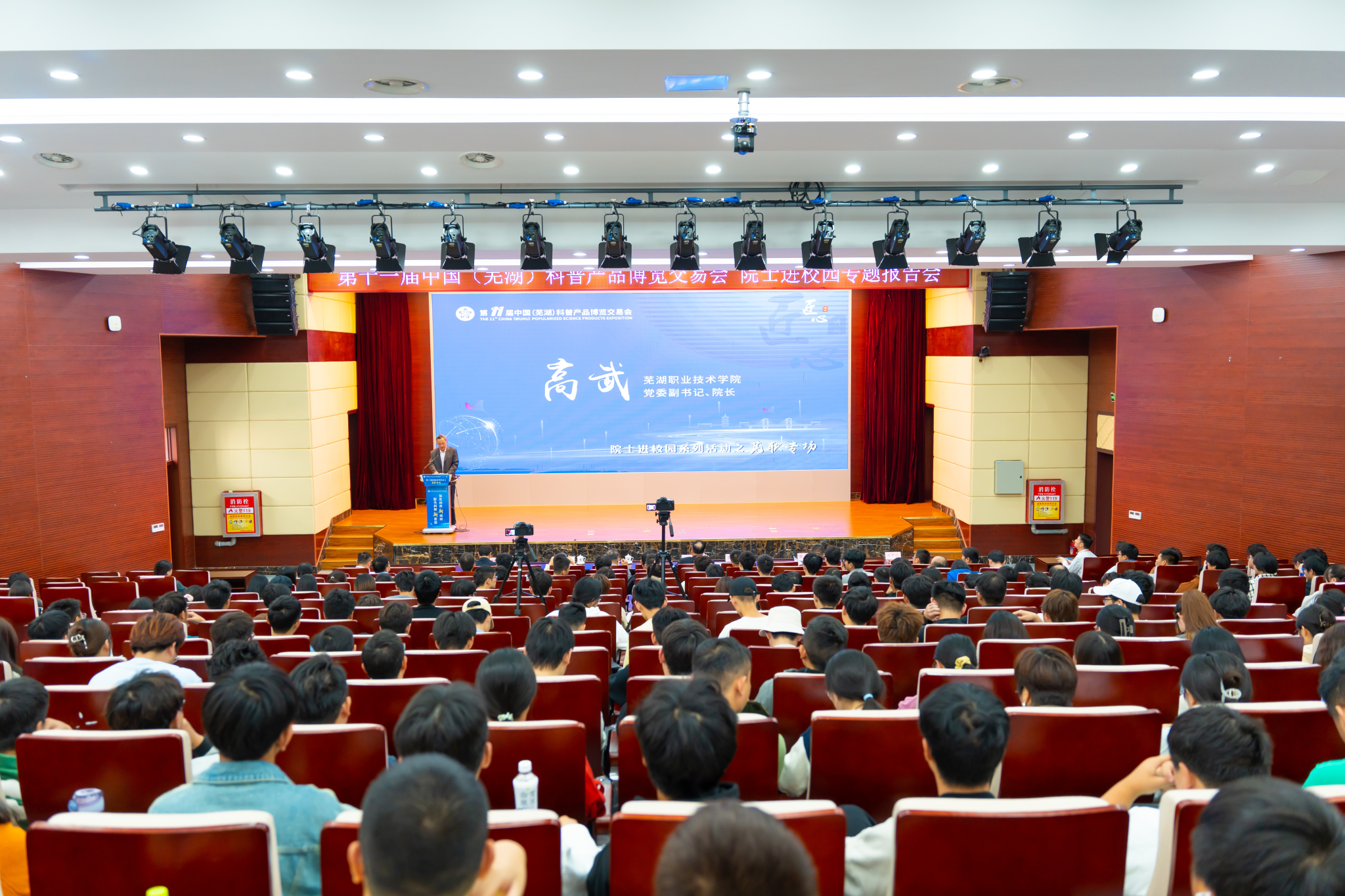 10月20日下午,学校在文津校区图书馆报告厅举办第十一届中国(芜湖)科普产品博览交易会院士进校园芜职专场活动,活动邀请了中国工程院院士谭建荣、日本工程院外籍院士李颉为我校师生作专题报告。芜湖市政协副主席袁发林、芜湖市科学技术协会副主席徐春芳、芜湖市数据资源管理局副局长方坚、中国计算机协会元宇宙专委会秘书长李强、求是经济与管理科学研究院研究员熊乜出席了本次活动,活动由党委副书记、院长高武主持。副院长刘育红、相关部门负责人及340余名师生现场聆听了院士报告。