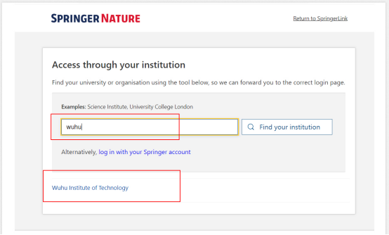 3、在页面 “Access through your institution”模块的选择框中输入“Wuhu Institute of Technology”,并选择对应结果,点击“Find your institution”