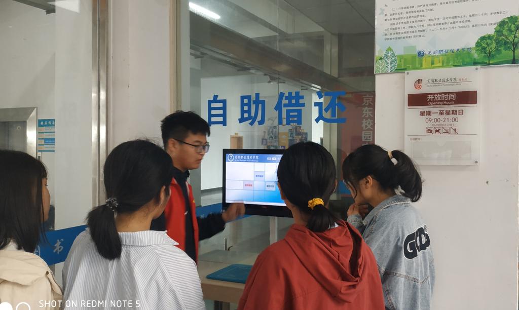 图书馆全体工作人员和图书馆学生管理委员会的同学们在各自的工作岗位上满怀热情,殷切等待,为新生答疑解惑。图管会、扬帆杂志社成员在图书馆二楼设置了新生接待处,分发宣传页,并将向新生推荐《扬帆》杂志摆满展台,以供浏览。图管会志愿者随时待命,带领新生参观图书馆,向他们介绍图书馆及借阅规则,带领他们体验自助借还机、电子自助查询触摸屏等。图书馆领导和老师多次亲临迎新现场指导工作,询问并解决问题。