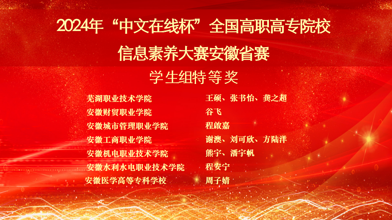 10月26日,2024年“中文在线杯”全国高职院校信息素养大赛安徽省赛区赛事在紧张激烈的氛围中圆满落幕。本次比赛由安徽省高校图书情报工作委员会和安徽省高校数字图书馆联合主办,吸引了省内25所高职高专院校的3618名学生参与,最终122名学生进入省决赛。在此次大赛中,我校学生凭借扎实的知识储备和良好的信息素养,在众多参赛者中脱颖而出,其中,网络工程学院的王硕、应用外语学院的张书怡以及园林园艺学院的龚之超分别获得全省第一、第二和第六名的优异成绩,共赢得三项特等奖、一项二等奖和一项三等奖。