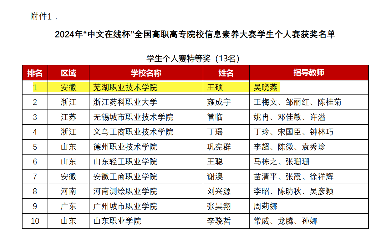 由图书馆吴晓燕老师指导的网络工程学院学生王硕,以总分全国第一的优异成绩荣膺学生个人赛全国特等奖;应用外语学院学生张书怡,在刘娇老师的指导下荣获全国二等奖。吴晓燕、刘娇老师获“优秀指导教师奖”,芜湖职业技术学院获大赛“最佳组织奖”。这一系列荣誉不仅标志着该赛事举办以来安徽省学生个人赛的最佳成绩,更体现了我校在全国高职高专院校中信息素养大赛的卓越地位与领先水平。