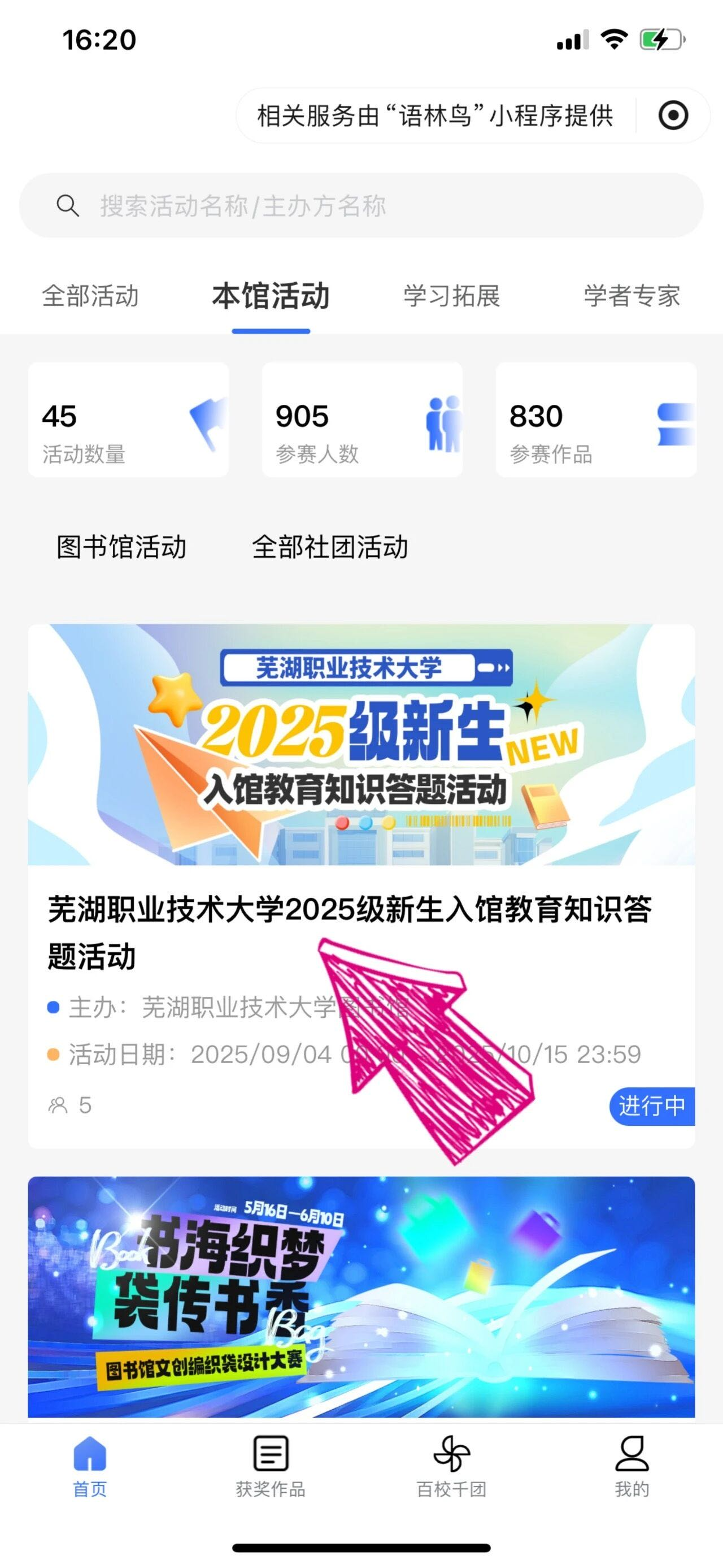 图书馆推出了趣味性与教育性并重的线上答题活动。新生通过关注图书馆微信公众号,即可参与入馆知识测试。系统随机生成20道题,内容涵盖图书检索、电子资源使用、阅览室规则等实用知识。全部答对者即可获得图书馆定制书签等小礼品,排名前六更可获得精美奖品。