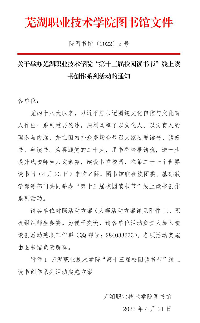 附件1 芜湖职业技术学院“第十三届校园读书节”