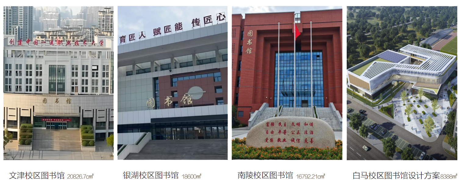 芜湖职业技术大学图书馆是一座集读者服务、参考咨询、学科服务为一体的信息化、数字化图书馆,分为文津、银湖、白马、南陵四个馆区,总面积达64606.91平方米。馆藏文献总量2301133册,其中纸质图书1380680册,数字资源920453册,纸质报刊1018种,阅览室座位3713个。